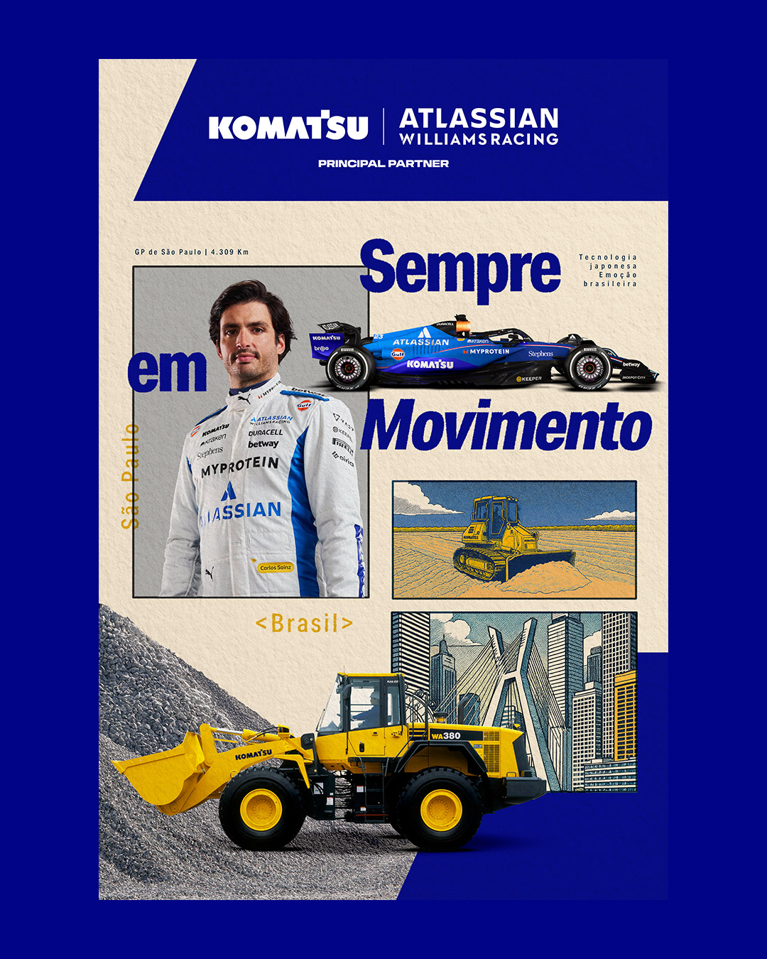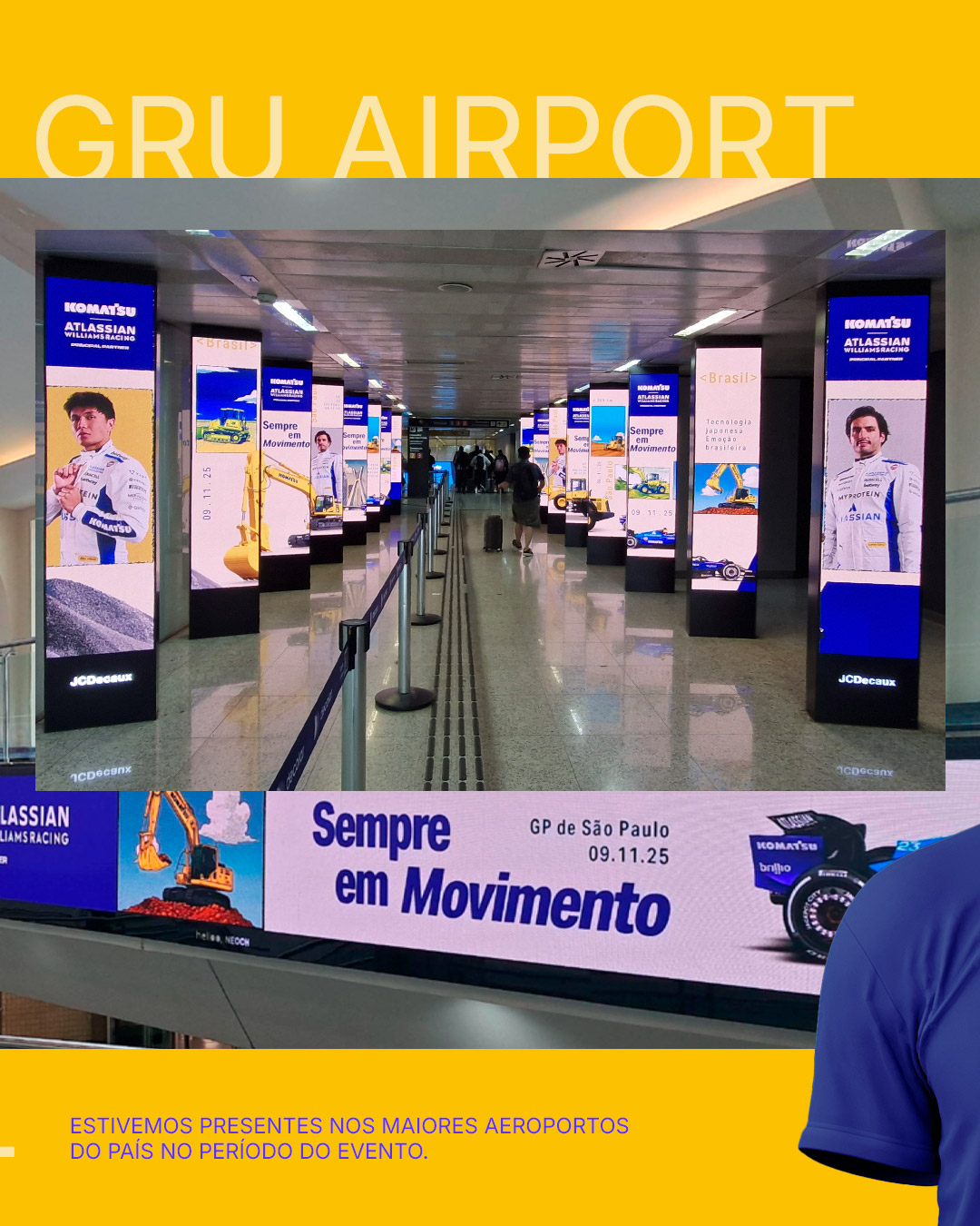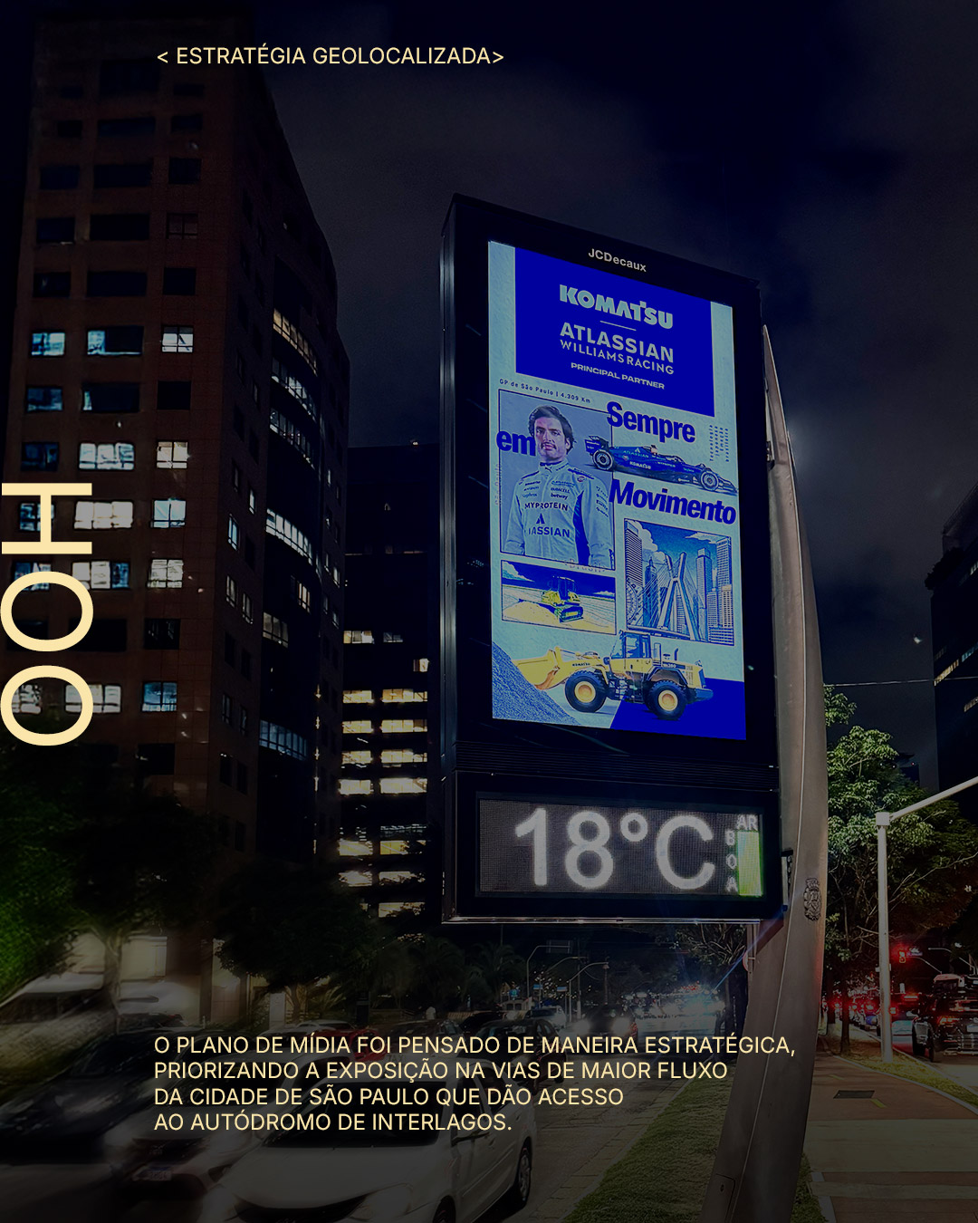 Na campanha “Sempre em Movimento”, criada por nós, transformamos essa energia urbana em narrativa — inspirada pela estética dos mangás japoneses, símbolo de continuidade, velocidade e transformação. A ação marcou a presença da Williams Racing e Komatsu no GP de São Paulo com uma estratégia integrada que tomou aeroportos, ruas e redes sociais, ganhando repercussão global.